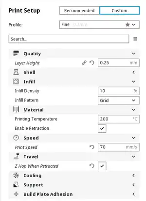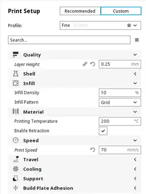 Set print speed. Expand Speed and set Print Speed to 70 mm/s.