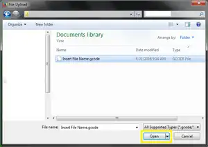 The "Browse" dialogue box. A dialogue box opens. Navigate to where the .gcode file from Cura is saved. Load the File. The filename should appear to the right of the Browse/Choose File button.