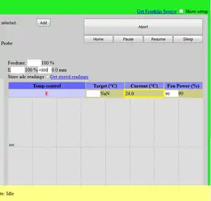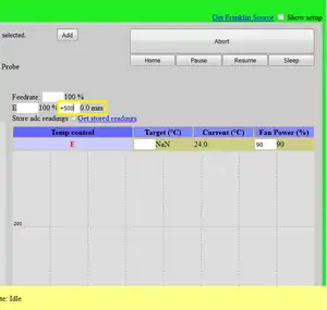 Location to type in extrude distanceIn Franklin, find the extrude text box located above the temperature graph. It is marked with 0.00 mm on the right. If it displays NaN on the right of the text box, instead of 0.0 mm, home the printer before continuing. Click in the textbox, and type in +500. Press enter, and begin to push the filament into the extruder. The extruder should grab it and push it into the bowden sheath.