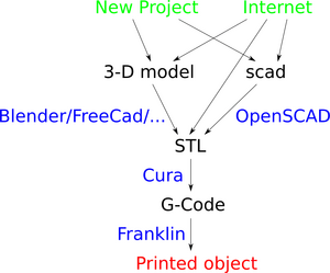 There are multiple steps from an idea to a printed object. The installation and basic usage of some important programs is covered below. The relations between the files (black) and programs (blue) is shown in the figure on the right.