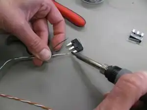 Solder extension to fan wires. Strip and tin both ends of a 1.5m length of 24ga twisted pair.