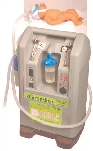 The Diamedica Baby CPAP machine has been designed for use in areas with limited resources. It is driven by an oxygen concentrator, thus eliminating the need for large quantites of expensive compressed gases. It provides controllable safe bubble CPAP with minimal running costs, for use with preterm babies, neonates and infants.