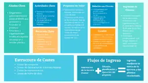 Sin embargo, el proyecto también considera asociaciones, como ADESCOS, y organizaciones no gubernamentales, similares a Salvanatura. Estos actores también son muy útiles a la hora de desplegar las barreras, pues, además de cubrir total o parcialmente el costo de estas, pueden proporcionar voluntarios. Por otro lado, el último segmento, que también forma parte del sector privado, son aquellas empresas interesadas por reducir su impacto medio ambiental o adquirir plásticos. Por ejemplo, Ternova y el Banco Hipotecario gozan de la capacidad de financiar la implementación del sistema a mayor escala, lo cual les permitiría mejorar su imagen corporativa y trabajar por el progreso de las comunidades.