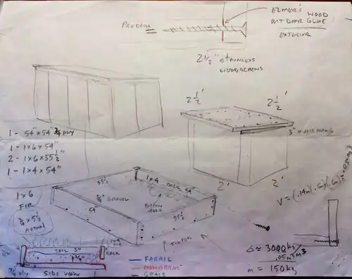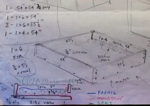 The living roof was designed based off the information given by the farm that the hutch being built would be a 4.5ft by 4.5ft structure. We were not told anything else about the hutch being built other than its proposed size. Because of the size of the roof it seemed practical to give the roof no more than a two degree slope to prevent soil erosion and allow water to drain naturally. Because we knew nothing of what the structure would look like we assumed an overhang of about three inches. The roof was asked to be built as low maintenance as possible therefore a simple one inch open was allotted for the back of the roof to allow water to flow backward naturally.