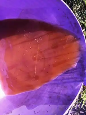 The bucket the water was collected with was not the same bucket used to place the water on the roof. Because of this and because we are on a farm that is dirty and exposed to the elements so was the bucket we used to collect the water. The particulate matter that is floating on the water was from the original bucket used to collect the initial drainage. That water was then decanter into this smaller purple bucket. We should have made sure the original collecting bucket was thoroughly rinsed out in order to yield perfect results. What we did notice was that the water was a red color and not a dark brown or blackish color. This lets us know that the water that is draining from the roof is currently not pulling any nutrients from the soil. The water is pulling the metals from the rocks.