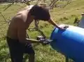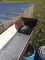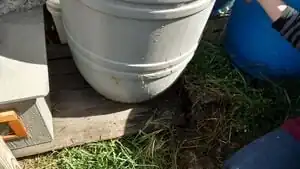 The pallet designed to keep the first storage tank upright is starting to break under the weight because no water has been removed from the tanks for crops. The downspout is crooked and stressed by the tank being lowered by the breaking pallet, and there's contaminant build up on the first flush container. Because of the neglect, there have been attempts to contact the farm to assist them in fixing and putting the system in to use, but as of 10/15/2016 no progress has been made on this front. Going forward this project could benefit from better instructions for the staff and volunteers of the farm that explain in detail the difference between the first flush and the storage containers.