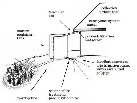 According to Gould & Nissen-Peterson (1999), a rainwater catchment system consists of the components listed below[3] and shown in Figure 2.