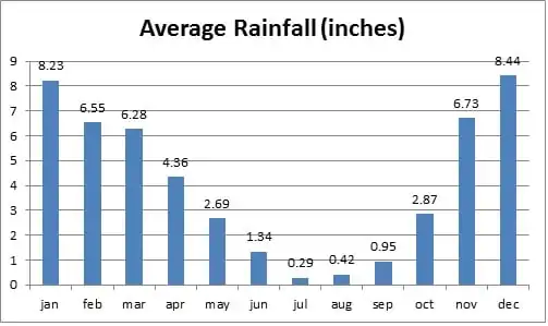 Arcata, the city where this project will be built, is very rainy. California has an average of 24.71 inches of annual rain, getting 14.5 fewer inches of rain than the national average (39.17 inches).[7] Different from the rest of California, in the last 30 years, Arcata has had an annual average of 49.15 inches of rainfall, which is 26% more than the average nationwide and 99% more than the average in California.[7] This means that Arcata does not have a problem with a shortage of rainwater. The only complication is that it rains a lot in the winter but not much in the summer. In the winter and fall, the average of rainfall is 23.22 and 13.33 inches per season, respectively.[7] Unlike in the summer and spring, the average rainfall is 2.05 and 10.55 inches per season, respectively.[7] Figure 3 shows the monthly average rainfall for the city of Arcata, where it is clear that the difference in rainwater availability is different throughout seasons of the year.