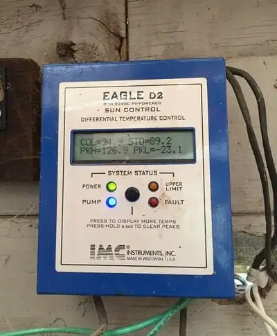 The PV panels on the farm are very old, but they work well for this operation. They are hooked up to a 12 volt battery, which remains charged because the pump does not run all the time. The system has an Eagle D2 Sun Controller, this controller uses thermistors to read temperatures of the water in the tank and, and in the solar collector. It then uses difference in temperature, and high and low readings to determine run time. Turning the pump on whenever it can heat the water in the tank. We hooked up the thermistors and the pump from the controller to the water heater. For the water in the tank, we hooked the thermistor to the heat exchanger pipe right where it comes out from the tank. For the solar collector, we connected the thermistor to the copper pipe as it just exits the panel. From that point all we needed to do was to check in on it and make sure it is operating properly. The day after we finished, the high temp in Arcata was over 80 degrees, the water in the tank got to 110 by the end of the day. The following weeks the water temperature in the tank would fluctuate between 88 and 105 degrees, hitting high temps on sunny calm days, while never dropping below 85 on cloudy days. The water remains warm because water has a great thermal mass, our tank is very large with good insulation, and the outside temperature rarely drops below 50 degrees.