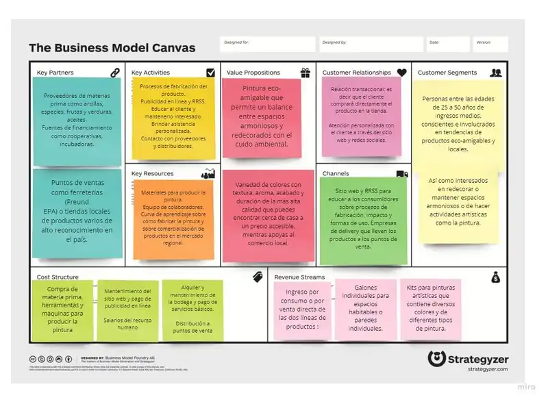 El Business Model Canvas de Bio-Pinturas funciona de la siguiente manera: nuestra propuesta de valor son pinturas eco-amigables que permiten un balance entre espacios decorados de forma armoniosa y radiante, a la vez que se toma en cuenta y se cuida el medio ambiente. Este producto está dirigido a adultos y jóvenes entre las edades de 25 y 50 años que posean ingresos medios y se encuentren muy comprometidos con el cuido del medio ambiente. Asimismo, estas pinturas también están destinadas a los amantes del arte que disfrutan de crear espacios y cuadros armoniosos por medio de su talento. Los productos se han pensado comercializar a través de dos tipos de canales. Por un lado, están los puntos como empresas de delivery y ferreterías para la distribución y venta directa de las pinturas. Por otro lado, se tiene las redes sociales y el sitio web para la comunicación directa con los clientes en la que se le eduque e informe sobre la nueva alternativa que se propone para darle vida y color a su hogar u oficina. Con esto se busca crear una relación directa y personalizada con el cliente, lo que aporta más valor y evita que la relación se limite a una meramente transaccional de compra directa. Gracias a estas relaciones, se busca obtener ingresos por ventas directas a través de dos líneas de productos: pinturas por galón y los kits artísticos.
