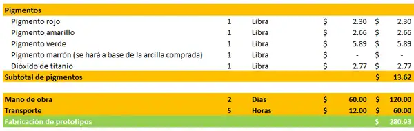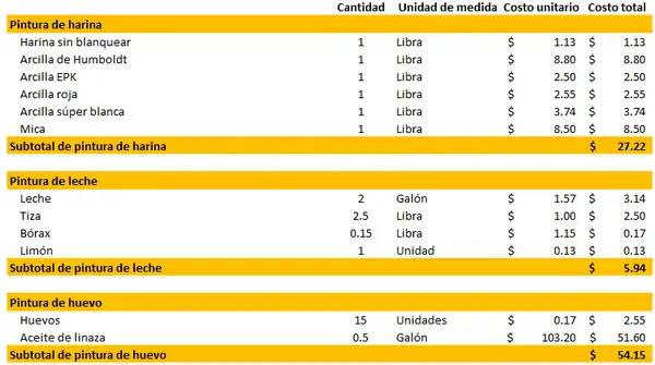 - Fabricación de prototipo. En este paso, se elaborará la pintura que será sometida a prueba. Actualmente, se desconoce la cantidad exacta que se hará del producto; por lo que, dentro del presupuesto, el costo se hará para un galón de pintura, el cual habrá que multiplicar por el número real de galones que se produzcan con el fin de obtener un registro más acertado de los gastos. Se elaborará la pintura de 3 tipos diferentes: leche, harina y huevo.
