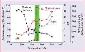 2. The gradual increase (cation exchange capacity and pH) or decline (carbon recovery) of other factors across the range of temperatures.