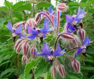 Borage has large furred leaves. The flowers are purple and star-like in formation. They are attractive to pollinating insects, and especially bees.