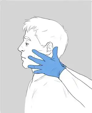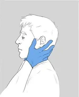 The rescuer in this scenario has decided to hold c-spine from the front of a sitting patient. This position allows for face-to-face conversation and may be useful for history gathering. The rescuer's hands can be placed with fingers pointing upwards or anteriorly, spread out to cover a greater surface area and in contact with the bony areas of the jaw and skull. This method of manual c-spine stabilization may expose the rescuer to increased risk from airborne and droplet borne pathogens.