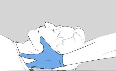 While kneeling or lying above the patient's head, the rescuer's hands should be placed on the side of the face/neck with thumbs extended to provide support to the side of the head. Fingers should be spread out to cover a greater surface area and be in contact with the bony areas of the jaw and skull. Avoid placing pressure on the soft tissues of the neck. If your hands are needed, your knees and thighs may be used as replacements for hands, if absolutely necessary.