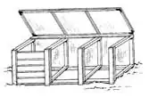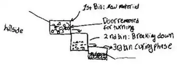 Three-tiered Hillside system- Similar to the design I chose, this system builds the bins in to a hillside. This makes turning easy- gravity assisted compost turning | The only hillside able to hold this system was located up hill from most of the garden. Plus having a potential rodent food source right next to the kitchen is not a good idea. |