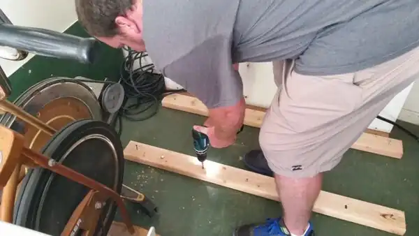 Step 5:Set wood where the new battery location is going to be, mark the wood where the drill holes need to be and drill through both the plank of wood and trailer floor. |