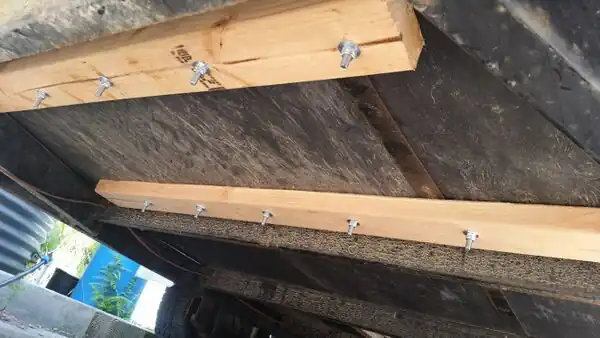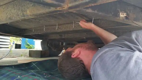The battery box is bolted down with 10 bolts make sure that there is no visible rust or damage to the bolts. Underneath the trailer there are 2- 2X4" boards visually inspect and feel for wood rot, if rot is present replace the board.