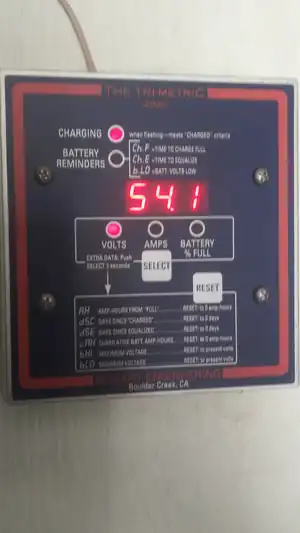 | Battery meter showing partial charging of battery | ![]() Inspect the battery state of charge (do not preform equalization). Use outside source to charge battery and see how battery preforms. If not preforming, possible have to purchase new batteries. |