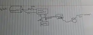 For the Spring 2015 Engineering 305 class at HSU, the bike powered tools team's goal is to make a bicycle powered system to provide an outlet primarily for the use of power tools in the Campus Center for Appropriate Technology (CCAT) tool shed. Currently, CCAT has to use a few extension cords that draw energy from the grid to run their power tools. The bicycle power system uses the energy provided by the rider to charge a battery to be used for power tools. Since a human can usually maintain around 100 Watts of power output for around an hour,[1] a battery is needed to be able to power tools such as a chop saw that needs between 1080-1200 W of power to run.[2] Ultimately, the stationary bike will turn a motor that will charge a battery that will have power tools plugged into an inverter. This bike powered tool station is an appropriate technology for generating electricity at CCAT. The project will help CCAT achieve net zero energy use by creating renewable energy on site for power tools.