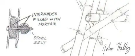 Little equipment is needed to build with bamboo, only simple tools. The manner of joining stalks is simple and secure. Wherever two pieces of bamboo connect, holes are drilled in the internode portion of the stalks. A bolt is pushed through both pieces, and the internodes are filled with mortar. The mortar distributes the load of the bolt through the whole piece of bamboo and prevents it from splitting.