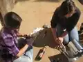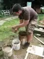 Greg drilling holes in the sides of the wooden boxes for our test bricks
