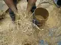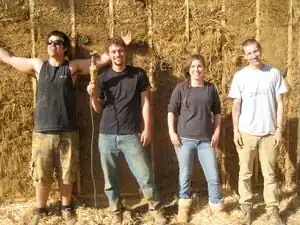 To build with straw bales requires a good understanding of the basic characteristics of straw and how it behaves as a building material. In general, straw and other natural fibers have low compressive strength but when twisted, interwoven, bundled, baled or combined with other materials like clay, their compressive strength improves dramatically and they can then be used for a variety of structural and non-structural building applications. However, it is important to remember that despite the improvement in strength, bales do compress under loads. The more compact the bale, the less it will compress. Bales you use for building should be solid, compact, and keep their shape when you handle them, especially if they will be asked to support the kind of bearing walls that we will ask them to.[9]