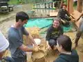After obtaining our design from the engineer that CCAT was working with we made our test bricks. We made four test bricks using scrap wood from CCAT. We measured the wood, cut it with the saw at CCAT, and screwed the sides. We left one side open on each in order to pack the slurry into the wooden box and also for proper drying purposes. Something that we learned during this process is that in order for the straw slip to dry properly and quickly we had to drill holes in the sides of the wooden frame before we packed the straw slip. The ratio that we thought worked the best for our project was 2 parts clay to 1 part straw. When we started making our test bricks we thought the ratio was clay to water but Professor Grafman corrected us by letting us know that the ratio was clay to straw and the water was just the magic that we added to our clay slurry in order to get the right texture.