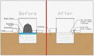 The Surge Tank is shown in Figure-2 before and after the modifications. A concurrent project has eliminated the need to remove particulates in the Surge Tank by installing a particulate filter under the kitchen sink. These developements allowed us to remove the mesh filer and increase the level of concrete in the tank, eliminating standing water and reducing the chance for FOG to accumulate upstream from the Switch and Swap.