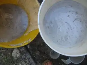I mixed it in five gallon buckets, in small batches as I read that the stain is less effective as time progresses. The solution must be stirred for a couple minutes, and I had to be sure not leave it for too long, otherwise the iron sulfate would solidify on the bottom. Straining the solution through cheese cloth, especially the coffee ground solution is a good idea. The solution then remains of the same concentration. I taped the cheese cloth over one five gallon bucket and dumped the other one in there. When someone else was around, they could hold the cheese cloth so I didn't have to use masking tape (yes! less waste!)