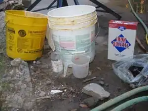 - E.g. a 2 1/4 qt. jug for measuring water and a 16 oz. jar for the iron sulfate