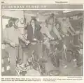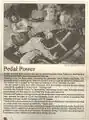 The pedal powered battery charger was designed and built by Bart Orlando at CCAT in 1996. It can be used to charge a 12v battery. The system consists of an exercise bike placed upon a pedestal as shown in the photo below. A fanbelt raps around the outer circumference of a 40lb - 16" flywheel and passes through a slot in the top of the pedestal. It then raps around a 2.5" pulley on a 1800rpm permanent magnet 24dc generator, mounted on the underside of the pedestal. When the exercise bike is pedaled at ~ 80 rpm, the generator spins at about half its rated rpm (~900 rpm), producing about half its rated voltage output (~15 volts). The faster you pedal, the higher the generators voltage output and the faster the battery charges. A diode is placed between the generator and the battery to prevent electricity from flowing back from the battery to the generator. If the diode was not used, the generator would draw electricity from the battery and function as a motor. A volt meter and amp meter are substituted for the mph gauge and effort gauge that come with the original exercise bike. The system was used to match the load of a 200 audio watt alpine car stereo amplifier driving a 200 audio-watt JBL speaker cabinet. The pedal powered PA system was used during open mike sessions on the HSU Quad for crowds of up to 400 people. It requires very little effort to pedal when used to power that PA setup. This charger is best suited for charging batteries under 100 amp hours. However, in 1998 class credit was offered to HSU students enrolled in a physical education exercise class for helping to charge CCAT's 2,000ah battery bank by pedaling one of the five pedal powered generators at CCAT instead of the life cycles in the university's weight room.