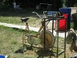 A fanbelt is wrapped around the outer circumference of the flywheel of the exercise bike and around a pulley mounted on the same drive shaft that the grinding stone and wire brush are mounted. The shaft is supported by two bearing assemblies. A 24 inch wheel rim is welded to the outer circumference of the flywheel in order to keep the belt on track.