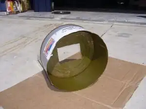 In the top half of the barrel, we constructed a skirt. This skirt surrounds the cooking pot, leaving a small gap on the bottom and the sides. The skirt was constructed out of a can. We used tin snips to cut a square opening in the bottom to channel the hot gasses. The top of the can was cut completely open with a Sawzall. The skirt is fastened to the shelf with screws and washers.