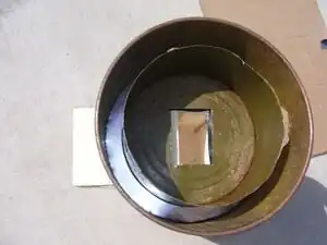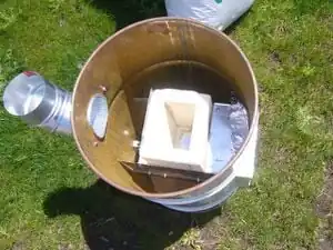Drill and tin snips are used to cut a square out of the barrel corresponding to the dimensions of the metal casing. The casing for the combustion chamber fits into the hole, protruding on both sides.
