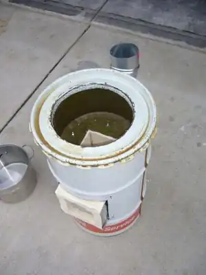 Vermiculite is poured into the barrel in order to insulate the combustion chamber. This insulation fills the space between the chamber and the barrel and is filled as high as the top of the chamber.