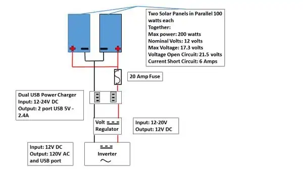 The solar kiosk is a charging station that has a "Dual USB Power Charger" that has its own volt regulator inside and a volt regulator to control the volts coming out from the panels at about 24V max and in to an inverter at 12 volts direct current (DC). The inverter is 200 watts which supports two 120V alternative current (AC) and has a USB port. There is also a 20 Amp fuse on the positive wire coming from the panels that will stop the flow of electricity if there is too high of a current flowing through.