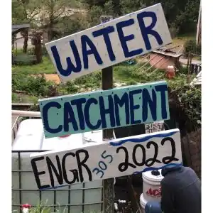 We are a part of Cal Poly Humboldt's Engineering 305 class of Spring 2022. This semester, we've worked on building a Rainwater Catchment System for the Campus Center for Appropriate Technology (CCAT). This project gave our team the opportunity to build our knowledge on calculating catchment and component sizes, while evaluating CCAT's water needs. The system is designed to water the onsite garden that has slowly become bigger every season. We hope to provide even greater access to water for CCAT, as well as access to knowledge of how our system has been built for years to come. CCAT's southside rainwater catchment system also pushes and practices new ideas for sustainability implementation. Water caught from CCAT's southside roof will be filtered before passing to the cistern. Any excess water that cannot be stored by the southside rainwater catchment cistern will be routed via overflow to the nearby CCAT green shed rainwater catchment system. This system is designed to capture and use as much rainwater as possible while mitigating rainwater waste as much as possible. We would like to acknowledge that this project was built on Wiyot land.