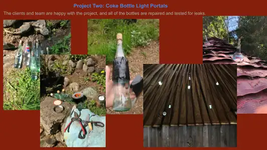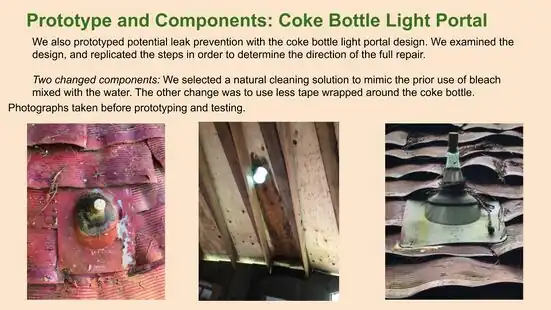 - Coke Bottle Light Portal: This design suits the current yurt, and we would only suggest placing the flashing below the aluminium shingles. Proper cleaning of the bottles is important. Our team would consider and recommend this alternative lighting design for other shelter structures based on it's usefulness, meeting our criteria, and ease of repair. Also we believe one could easily substitute parts of this design if needed.