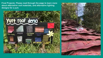 - Alternative Yurt Roof Materials Board: This served as a valuable lesson and research into up-cycling and reusing of alternative materials for roofing. We learned a great deal about reaching out to our community to inquire about donations for materials.