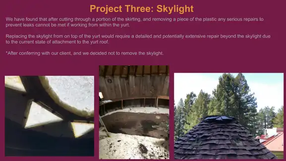 - Please note: Our third project required any work for the skylight to be completed from within the yurt because we did not have permission to be on the roof for any renovations.