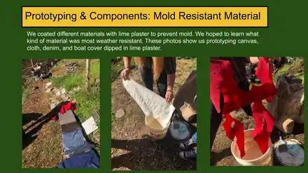 | Prototype: Test potential roof material with lime for mold. Also, test natural solvent for leak resistance. | March 16 | March 16 |