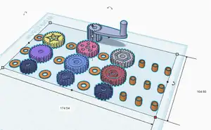 The gears used in the book are 3D printed from green Prusa 3D PLA filament using a Prusa MK3S 3D printer at 15% infill with gyroid infill. Two sizes of spur gear were created by using the website evolventdesign.com to create the outlines of the gears, which were then imported into TinkerCAD and extruded to a depth of six millimeters. All of the gears have an internal diameter of 6.05mm, the larger have a diameter of 27mm, and the smaller have a diameter of 17.8mm. Also printed with the gears are washers and sleeves for the 4.6mm diameter screws that hold the gears in place. The crank is designed using one of the 17.8mm gears extruded upwards to 16mm.
