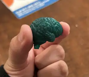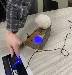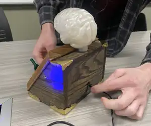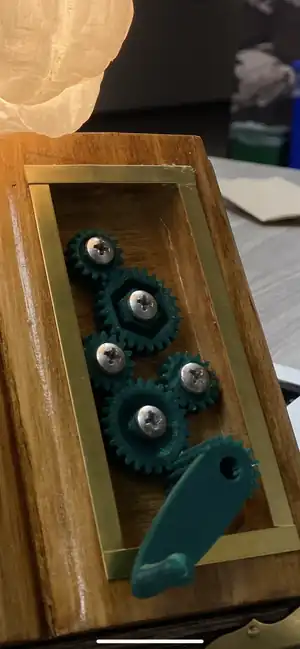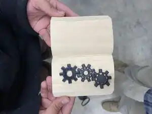 When creating the second prototype, we discovered that the dimensions of the base needed to be smaller to fit the dimensions of the hand carved wood book. The hand carved book was smaller than that of the final trophy mainly due to the lack of materials, but it proved to be a sturdy and easily carvable medium. Gears were designed in tinkerCAD and 3D printed using black PLA filament. The second prototype helped us determine that the teeth of the gears needed to be more precisely designed to ensure that they turned together properly. The brain was also designed in TinkerCAD and 3D printed using black PLA filament. We learned that the PLA filament was a strong enough material for both the brains and the gears. The process of printing both the gears and the brains allowed us to refine our print settings for the final trophy.