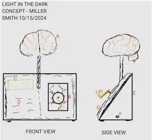 The first prototype was designed based on the “Light in the Dark” drawing concept created by Miller Smith. It was created using a cardboard base and cardboard book. Layers of paper were laid on top of the cardboard book to mimic the look of paper pages. A rectangle was cut out on the right side of the book to house the gears. The gears were also made of cardboard and cut out by hand. They were fixed in place in the cutout using clear tape. A gold push pin was added to the middle of the gears to determine the placement of the cardboard gear crank. The brain was created using a plastic mask casing and placed on the cardboard stem. The first prototype gave us a better idea of the future dimensions needed for the base, book, brain, and gears. It also allowed us to decide that the brain’s placement needed to be changed as well as the crank’s placement.