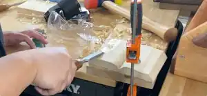 We started with a 7.5 x 3/4 x 48 inch plank of poplar wood and cut off 5.5 inches of length. We kept the other dimensions of the plank as these accounted for later adjustments. The exact midpoint of the 7.5 inch side was measured and marked to later become the seam of the book. Another mark was made along the width of the book that is 50 degrees from the bottom corners; these will be cut along to appear as pages, with 3 millimeters left at the bottom to act as the cover of the book. A router with a bit that was an inch wide and 90 degrees from the top was used to cut along both the middle and the sides. A saw was taken to make the middle seam slightly deeper, and then a straight chisel was used to smooth out the sharp turns. The same chisel was used to increase the degree of the page edges and slightly taper down away from the middle. This was sanded down smooth. On the right side, a 11 cm by 5 cm window was drawn on to later become the window for gears. The corners of this window were made using a drill press that went all the way through the book. These corners were connected using a scroll saw, creating a hole through the book. These edges were straightened and refined with a chisel. The plate that sat on the back of the book needed a place to sit in so it would be flush with the entire back. This was done entirely by hand with a chisel and then glued down and gaps filled with wood filler. The hollow was sanded to satisfaction and then holes were made with the drill press in places where we wanted gears to lay. The gears are held down by screws and lay on top of washers so when the crank in the corner is turned, they all turn together. The left side of the book is where the first place plaque is etched using a laser engraver. It is an original design by the team with inspiration from old story books, and traditional trophy plaques. The whole book is stained with golden oak stain and coated with clear polyurethane finish.