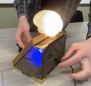 The final trophy is an open book set on an angled base. The book page on the right has gears placed in a hollowed out window. Rotating a crank at the base of the gears lights up the brain in a pulsating pattern.