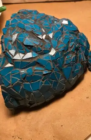 The acrylic mosaic section, seen in the back left of Figure 1-H, was 3D printed slightly smaller than the other sections, and then covered with small pieces of a blue acrylic sheet and grout. The stl file of the back quarter of the right hemisphere was sized down using PrusaSlicer by reducing the vertical z-axis by 5.2 mm (twice the width of the blue acrylic sheet). The sheet was broken apart into pieces the size of the small geometric surfaces of the 3D print, and these acrylic pieces were glued directly to the print using E-6000 glue. Next, grout was applied, making sure to fill all cracks between the acryllic pieces. Excess grout was removed using a sponge and paper towels were used to clean any remaining haze from the acrylic pieces.