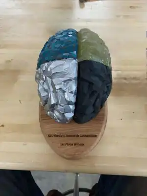 This design incorporates 6 materials with 6 respective fabrication processes joined together in the form of a conglomerate brain resting on a redwood base. The design highlights elements of the interdisciplinary research category of the competition, such as integration of distinct entities to form a whole greater than the sum of its parts. The design also represents the culture of CPH, which has an emphasis in hands-on STEM programs (Science, Technology, Engineering, Mathematics). Two twin brain trophies with this design will be given out to winners at the 2025 CSU Student Research Competition.