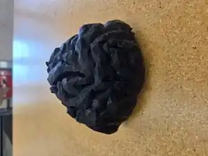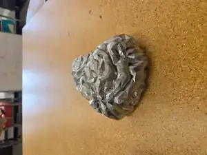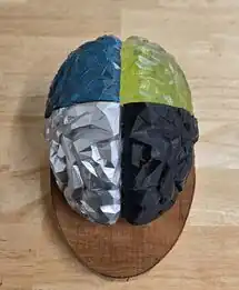 The brain itself consists of 5 sections. Figure 1-D shows the the front right section of the brain which is clear resin with hints of green and gold alcohol dye. Figure 1-E shows the front left section of the brain which is a white 3d printed filament spray painted with a metallic paint. Figure 1-F shows the back right section of the brain which is a 3d printed filament with blue acrylic triangle pieces attached to the filament and black grout to fill in the gaps. Figure 1-G shows the back left section of the brain which is a black squishy 3d filament. Figure 1-H shows the bottom section of the brain, also known as the cerebrum, and this section is made out of clay from a construction site on CPH. All 5 of these sections are attached together permanently to make one solid human brain. Once all the pieces are together the brain is roughly 3 to 4 inches tall, 8 to 9 inches long, and 5 to 6 inches wide. The solid brain weights between 1-2 lbs.